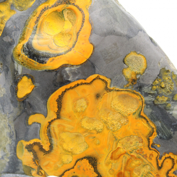 Discover this collection of bumblebee jasper, polished stones in a variety of shapes and sizes. Each piece features distinct patterns and shades of yellow, orange, and black, characteristic of this unique mineral. Ideal for collectors, these stones add a natural and colorful touch to any space.